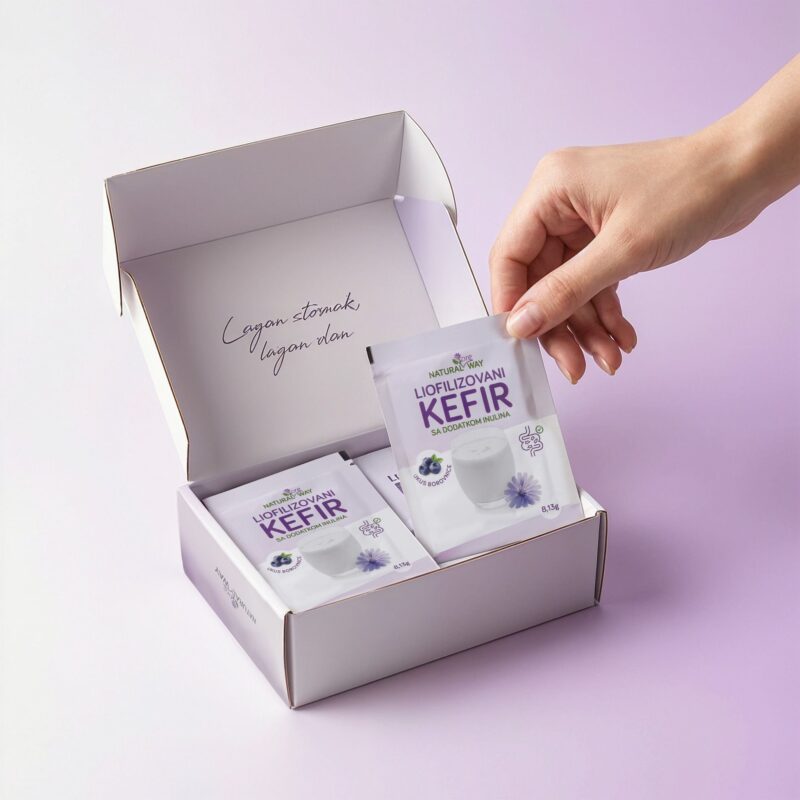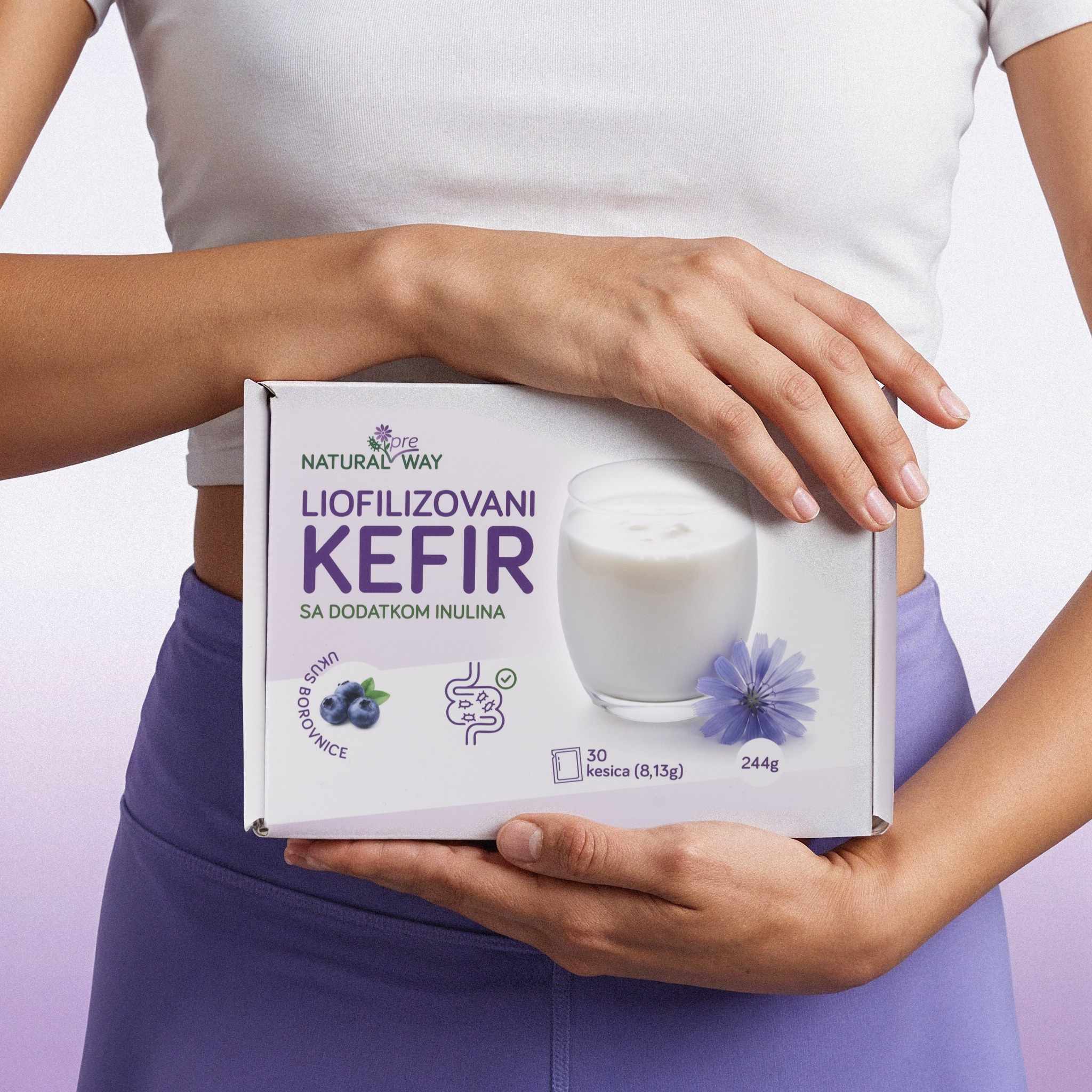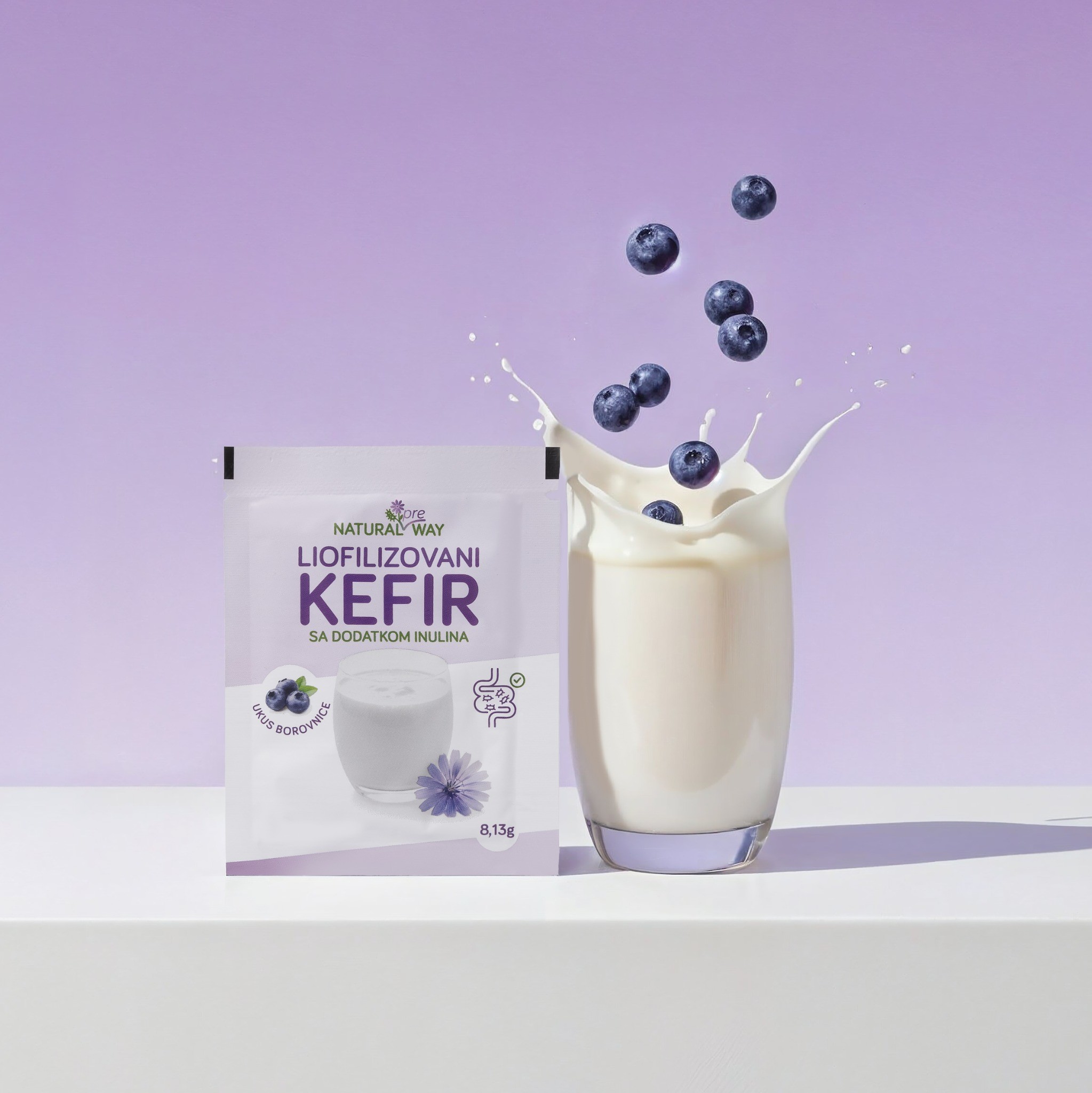 Kefir smo liofilizovali što znači da smo mu izvukli vodu na dubokom minusu i sada je u prahu, a dodali smo mu inulin i borovnicu. Kao što možda znaš, kefir u tečnom stanju ne prija baš svima, ali uz borovnicu dobija prijatan ukus i miris, dok benefiti kefira ostaju isti, a sa dodatkom inulina povećavaju se.