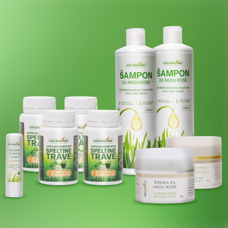 Ako želiš baš sve – i za organizam, i za kožu, i za kosu – i to na duži rok, ovo je taj paket. Dovoljno kapsula da pokrije i jače periode (posle virusa, hormonskih haosa, stresa), plus krema za negu kože, krema za negu zrele kože lice, šampon i labelo. Sve možeš sam/a da ikoristiš, a možeš i da podeliš deo sa najbližima.