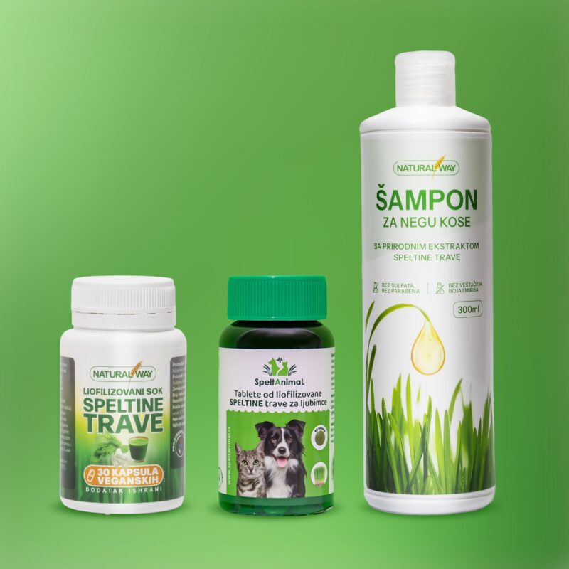 Ti imaš kapsule soka od speltine trave za jačanje organizma i biljni šampon koji obnavlja kosu i kožu glave, dok tvoj ljubimac uživa u Speltanimal tabletama – potpunom prirodnom suplementu koji čisti organizam, vraća sjaj dlaci i zdravlje koži. Idealan paket ako želiš da u kontinuitetu brineš i o sebi i o svom četvoronožnom cimeru.